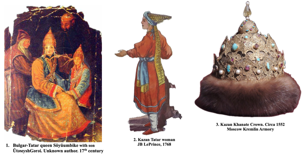 We took a liberty of improvisation, and imagined how this unique colorful leather hat would accentuate a Tatar Muslim woman’s look. Although this type of elongated headwear is not in the Tatar fashion anymore, it does bring forward three historic imagery: 1) iconic depiction of Bulgar-Tatar queen Söyüumbike (1513-1553)by unknown author of 17th century, 2) intriguing drawing of Kazan Tatar woman by Jean Baptist Le Prince (1734-1781), and, 3) the Crown of Kazan Khanate (1438-1552) that was submitted to Ivan IV of Muscovite Tsardom in 1552, and it is now resting in Moskva Kremlin Armory of Rossiyan Federation.