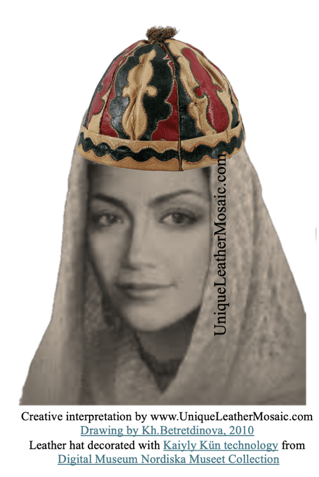 This one-of-a-kind leather hat had been created with 1) colorful soft leather cutouts, 2) stacked to create stylized Turkic-inspired design, and 3) manually attached with distinctive inward stitching. This unprecedented example of the headwear decorated with Kaiyly Kün technology is only the second kind that we have ever encountered (Read about our first discovery in digital collection of National Museum of Finland here).