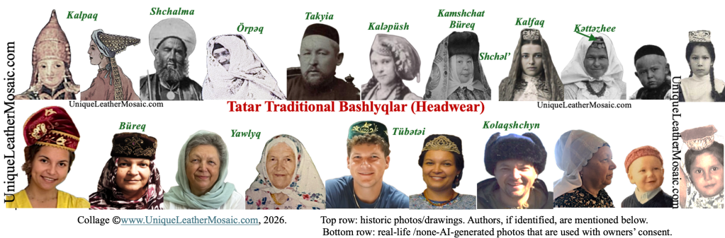 Would you fancy your look with a tübәtәi, kalfaq or büreq? These and several other bashlyqlar are the types of Tatar headwear that are an integral part of the traditional Tatar image, identity, and costume. Covering the head became especially significant for the Tatars from the time their forefathers and foremothers (the Volga Bulgars), accepted Islam in 922 CE: It gained religious and mental importance. In Islam, wearing a headcover symbolizes humility, modesty and respect to the Creator. It signals care about community. It indicates openness and desire to seek knowledge.