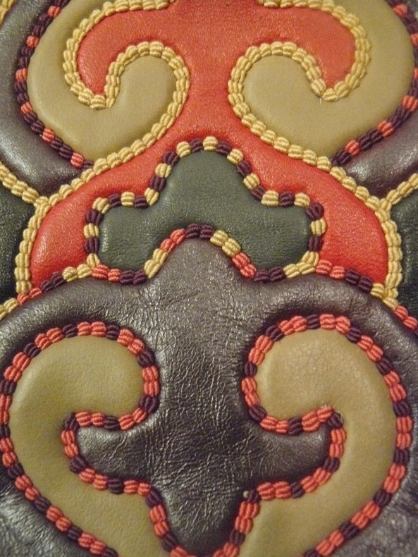 Developed by the proto-turkic nomads in Iron Ages, mastered and promoted by the Volga Bulgars (later called Volga Tatars), exceptional leather crafting, reached its zenith in late 19th-early 20th centuries, when the Volga Tatars refined it to become an exceptional Art ofKaiyly Kün– кайылы күн originally in Tatar (pronunciation here). The closest English alternative is Tatar Leather Mosaic. Such terms as inlaid leather, patterned leather, ornamented leather, mosaic leather, uzornaya kozha are also utilized. Kaiyly Kün is a unique and unprecedented alliance of the Tatar ethnic patterned cutouts of soft colourful leather that are skilfullyhand-stitched to create impressive meaningful or abstract designs. The pieces are stacked and attached to each other from the back with so-called Kazan stitch that looks like embroidery on the outside.