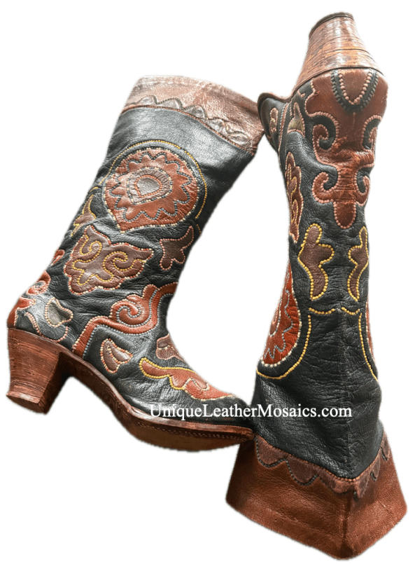 Widely popular and famous across Europe and Asia in 19th-early 20th centuries shchiteq– short for kaiyly kün eshchke (shchigelgen) iteq (also referred as Tatar boots, Kazan boots, Asian boots, ichigi )- are crafted using unique Kaiyly Kun (Tatar Leather Mosaic) technology. (View pronunciations here) . Worldwide, many museums have examples of antique uniquely-patterned boots created by the Tatar masters in late 18th-early 20th centuries. The boots are labeled as Kazakh, Uzbek, Ukrainian, Russian, Crimean, Tatar, etc., usually specifying a geographical local the exhibit came from rather than origination of the technology. Successful Tatar leather artisans and entrepreneurs not only manufactures uniquely decorated footwear in Kazan,Tatarstan, but also had travelled far to open workshops in Central Asia, Caucasus, Eastern Europe, cities of Rossiyan Empire. They traded their unique leather footwear making skills, and trained apprentices throughout European and Asian continent.