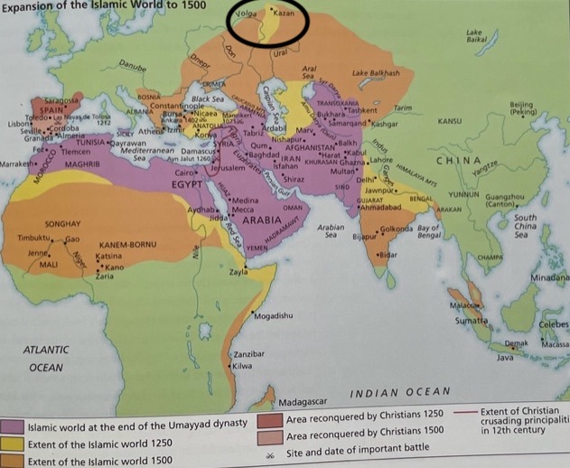 In 1236, Volga Bulgaria was invaded by the Genghis’ army (that consisted of Turkic people referred as “Tatars”), later in 1259 becoming an independent Ulug Ulus/ Kipchak Khanate / Desht-i-Qipchaq/ Golden Horde. In 1396, The Golden Horde broke into small “Tatar” khanates. Since then, the Volga Bulgars and other Turkic (non-Slavic) indigenous people of EurAsia became referred as Tatars by the European sources, and later by the Muscovite ideologists (Interestingly, the modern Tatars used to self identify themselves as Muslims, Bulgars , and only in early 20th century as Tatars). Around those times the Muslims-Bulgar-Tatars started migrating to various areas of the modern Rossiyan Federation. Those Tatars are referred now by the location they had settled in: Astrakhan, Siberian, Tyumen, Nogai, Crimean Tatars.