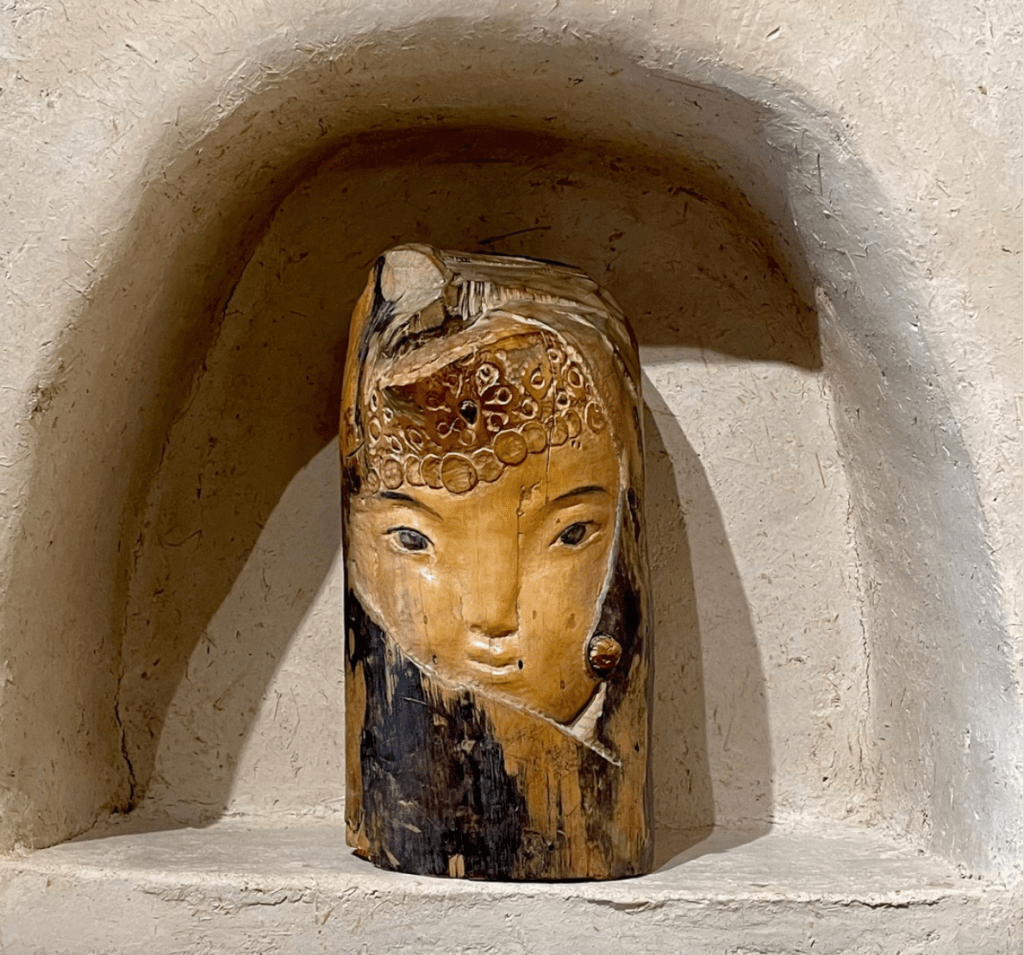 Kazan, the capital of Tatarstan Republic, is and has been a unique place of co-existance of Muslim, Christian, pagan, Turkic, Slavic and Finno-Ugric population in Rossiyan Empire, USSR, Rossiyan Federation. This unique conglomerate of diversity of cultural cues influenced Feshin’s art and his interest in depicting the native people of the lands, both of Tatarstan and of then Mexico-now-USA. This one-of-a-kind carving of Tatar/Turkic girl is housed in the Taos Art Gallery that is in the house designed, built and carved by multi-talented Nikolai Feshin himself.
