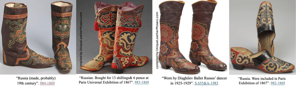 Although the museums tend to label these boots in accordance with the area they come from to their collections, those labels do not always accurately credit the authorship of the unique craftsmanship and technology of the exquisite leatherwork: The boots are crafted using ancient unique Kaiyly Kün (English alternative: Tatar Leather Mosaic) technology which has been developed, mastered and promoted by the Volga (Idel-Ural) Tatars on their indigenous lands of the Volga Bulgaria (now Tatarstan Republic of Rossiyan Federation). The craftsmanship of shchiteqler is exquisite and was specifically in great demand in 18th-early 20th centuries. The trade of the Tatar boots was popular and profitable: Shchiteqler were produced by large manufacturers and small individual entrepreneurs in Kazan-Arshcha and exported to many countries (the museums’ labels tell!) as well as crafted by individual Tatar masters and apprentices in vast Muslim-populated areas of Russian Empire, Central Asia, Siberia, Eastern Europe, Caucasus.