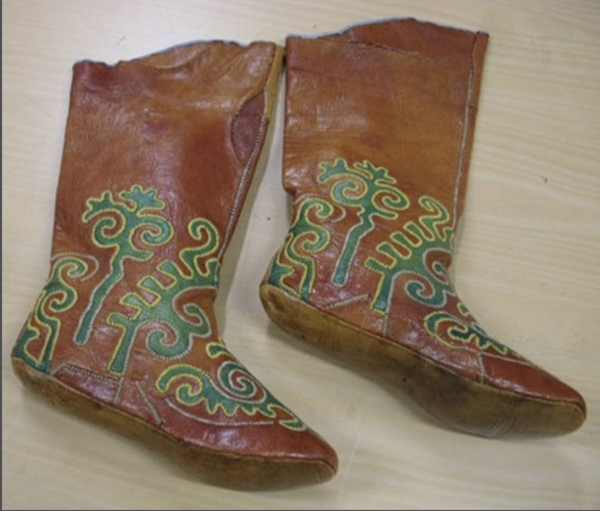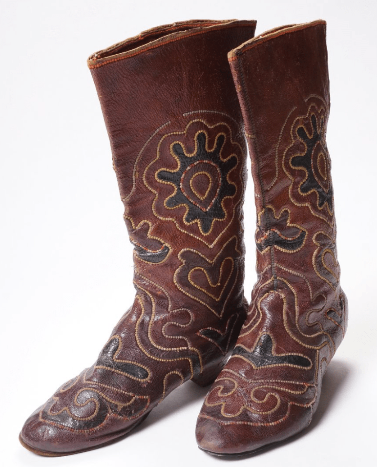 - The story of this boots offered by Invaluable (a marketplace for antiques) is creative but has no valid factual base. It should be noted that footwear of indigenous people of Americas, indigenous people of Volga-Urals as well as fanciful boots of American cowboys – all have one common denominator: they are made of genuine leather and beautifully decorated. But decoration patterns and techniques are all unique and should be recognised and celebrated individually!