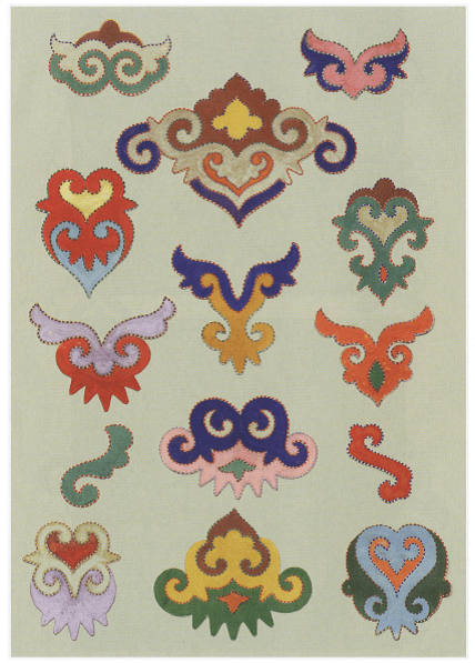 The Tatars have been proficient in jewelry, textile, embroidery and leather crafting for centuries. The Tatar decorative art carries traces of delicate and intricate combination of floral, vegetative, zoomorphic, geometrical elements that are influenced by traditions and beliefs of Saka (Scythians), Turkic nomads, Islamic artful interpretations of beauty. The art of leather mosaic is a unique artistic form mastered by the Volga Tatars: it stacks and aligns cutouts of ornamental soft colored leather patterns by cord-like decorative inward stitching. Variations of curvilinear lotus-, horn-, clouds–like stacked shapes create the baseline for the leather mosaic designs that are symbolic in nature.