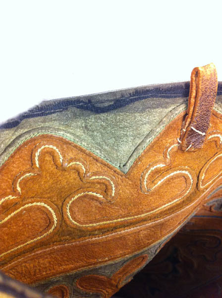 The process of working the leather mosaic is tedious, but creative. It starts by developing ornamental patterns and choosing color combinations of leather and threads. Then the patterns are cut and stitched by hand. Depending on the complexity of the chosen design, it can take from a week to several months to perform a decorative stitching. When the patterned mosaic is ready, the leather piece is dampened and stretched. The last stage is the incorporation of the mosaic into the specific item (boot, bag, pillow, jacket, belt, chair cover, wall art).