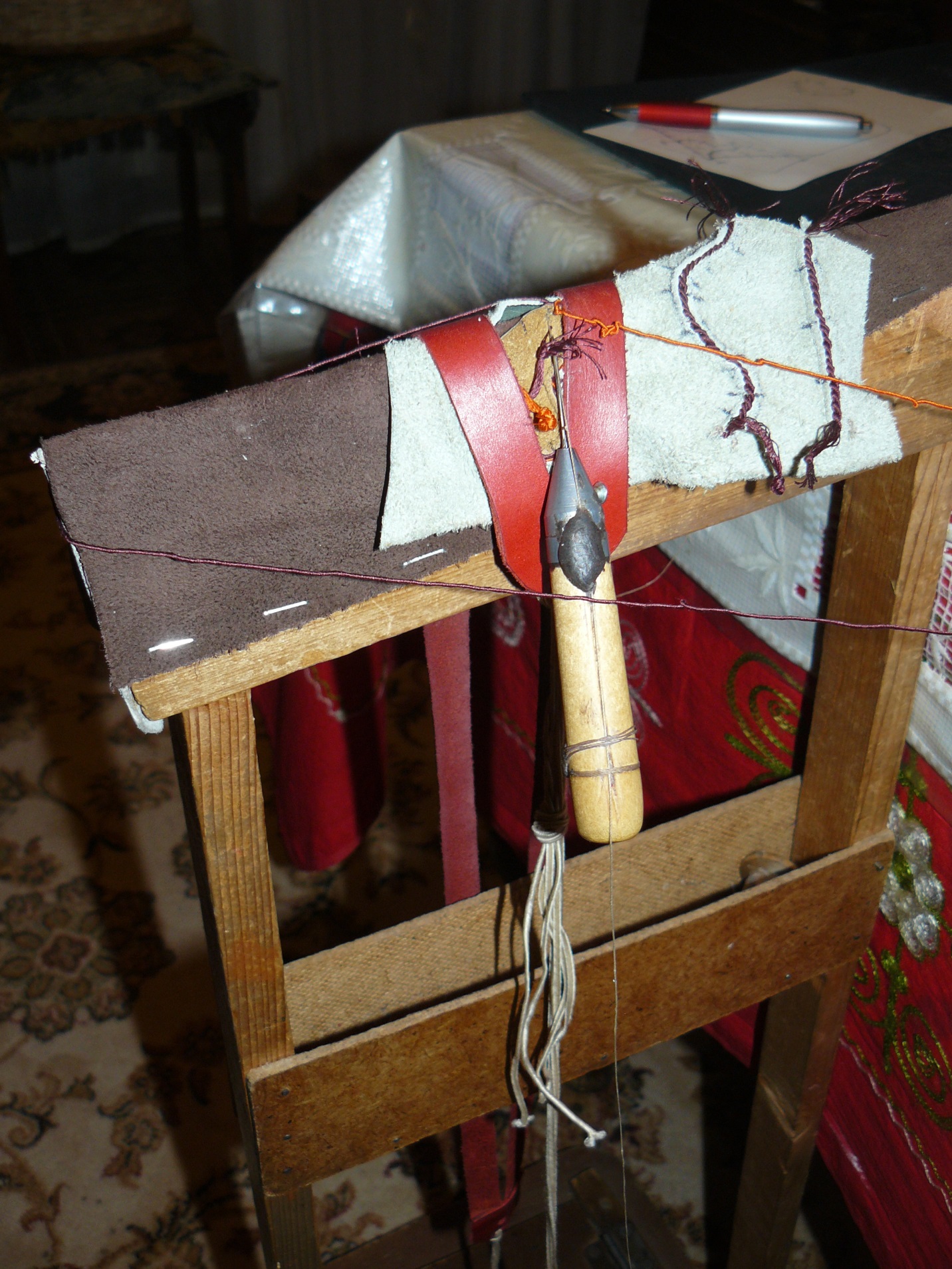 - Take the spindle with twisted embroidery thread (or spool of pre-made), make the knot at the loose end and place it under the closest leather strap.