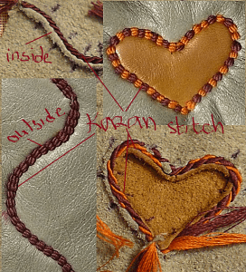 The essence of “Kazan” stitch is three loops of twisted decorative thread circled around a sturdy connecting thread and squeezed between the two pieces of soft leather. This type of stitching, that is originated from an ancient inward two-needle stitch, can be found in the leather items created in areas of Central Asia, Middle East, Balkans, North Africa.